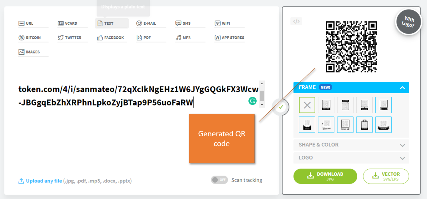 Paste the token URL in the site's text box, it will automatically generate the QR code and draw it on the top right corner: